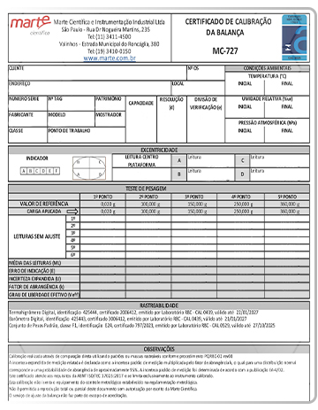A Marte Científica realiza calibração em balanças multimarcas conforme os requisitos da norma NBR ISO/IEC 17025, utilizando pesos-padrão rastreáveis à RBC – Rede Brasileira de Calibração.
