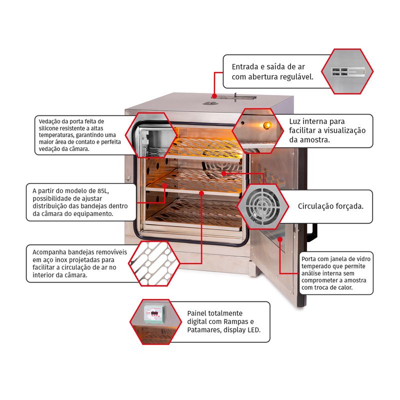 A estufa possui um display LED de 4 dígitos e um sensor de temperatura tipo PT 100 de 3 fios, permitindo programação de tempo de 1 a 9999 minutos com resolução de 1 minuto.