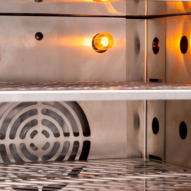 Com janela de vidro temperado na porta e iluminação interna, que permitem a visualização interna sem a necessidade de abrir a porta no meio do processo, o que desestabilizaria a temperatura.