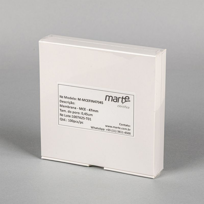 As Membranas Filtrantes em MCE da Marte Científica são desenvolvidas para aplicações laboratoriais que exigem alta eficiência de retenção de partículas, compatibilidade química e baixa adsorção de analitos. Indicadas para a filtração, clarificação e esterilização a frio de soluções aquosas e orgânicas, são amplamente utilizadas em análises microbiológicas, cromatográficas, bioquímicas e farmacêuticas. Fabricadas com diâmetro de 47 mm, as membranas estão disponíveis em porosidades de 0,22 µm e 0,45 µm, oferecendo desempenho ideal conforme o tipo de aplicação. A estrutura simétrica da MCE proporciona alta taxa de fluxo, boa resistência mecânica, excelente retenção de partículas, baixa adsorção de proteínas e superfície lisa e uniforme, favorecendo a observação direta em testes microbiológicos e análises sob microscopia. São fornecidas não estéreis, destinadas ao uso único e produzidas sob condições controladas e otimizadas, assegurando qualidade, pureza e desempenho superiores.