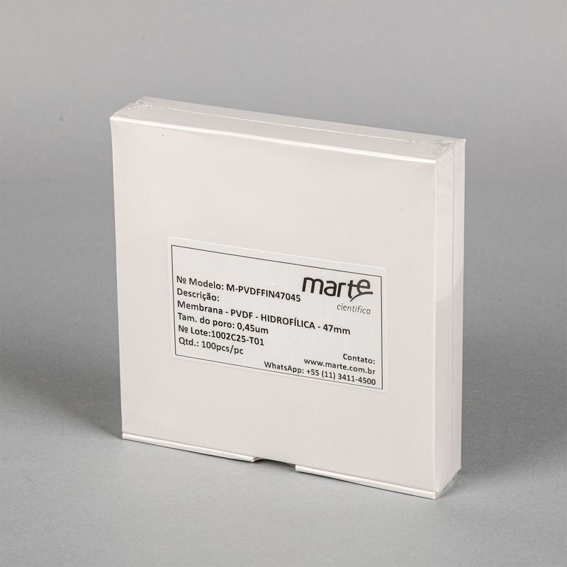 As Membranas Filtrantes em PVDF Hidrofílico da Marte Científica são desenvolvidas para aplicações laboratoriais que exigem alta eficiência de filtração, resistência química e baixa adsorção de analitos. Indicadas para a filtração, clarificação e esterilização de soluções aquosas e orgânicas, são amplamente utilizadas em análises microbiológicas, cromatográficas, bioquímicas e farmacêuticas. Fabricadas com diâmetro de 47 mm, as membranas estão disponíveis em porosidades de 0,22 µm e 0,45 µm, oferecendo desempenho ideal conforme o tipo de aplicação. O PVDF Hidrofílico combina excelente compatibilidade química com alta resistência mecânica e térmica, proporcionando baixa adsorção de proteínas, mantendo fluxo constante e reprodutibilidade elevada mesmo em condições críticas. São fornecidas não estéreis, destinadas ao uso único e produzidas sob condições controladas e otimizadas, garantindo qualidade, segurança e desempenho superiores em laboratórios de pesquisa, controle de qualidade e produção.