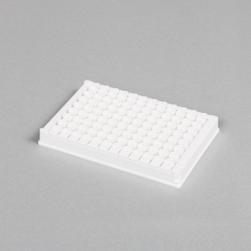 Cada microplaca é composta por 12 tiras removíveis de 8 poços, encaixadas em uma moldura de 96 poços padrão (12×8), o que proporciona flexibilidade no uso por ensaio e economia de reagentes.