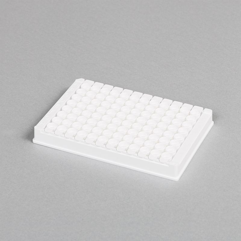 Cada microplaca é composta por 12 tiras removíveis de 8 poços, encaixadas em uma moldura de 96 poços padrão (12×8), o que proporciona flexibilidade no uso por ensaio e economia de reagentes.