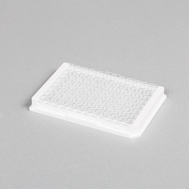 Cada microplaca é composta por 12 tiras removíveis de 8 poços, encaixadas em uma moldura de 96 poços padrão (12×8), o que proporciona flexibilidade no uso por ensaio e economia de reagentes.