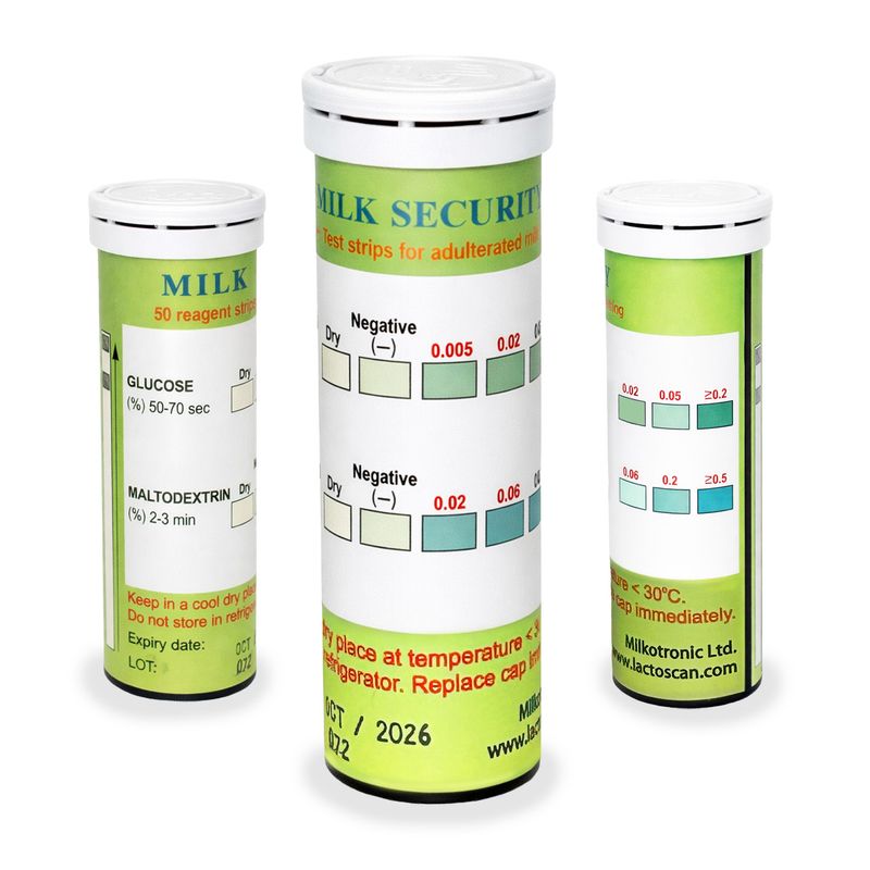Tiras secas para análise rápida e semi-quantitativa de adulteração em leite, com alta sensibilidade para glicose e maltodextrina. O método é colorimétrico em tiras, permitindo leitura visual sem uso de equipamentos.